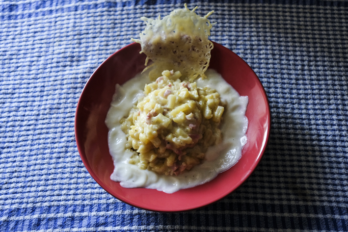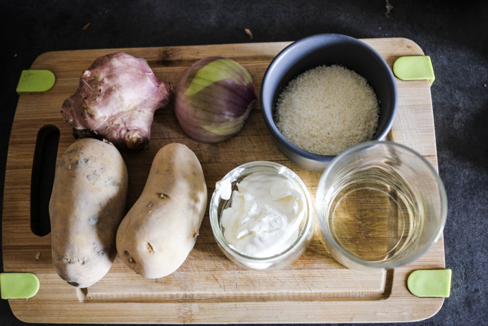Donc aujourd’hui on se fait un risotto de pomme de terre avec un velouté de topinambour.
