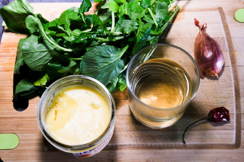 Bon c’est tellement simple qu’on va pas faire d’étapes. Tu coupes ton échalote. Tu la fais revenir sans qu’elle brule, tu rajoutes le cresson que tu as haché grossièrement et éventuellement le piment coupé en petits bouts. Bien sûr tu as pensé à enlever les plus grosses tiges du cresson et les feuilles jaunies. Bien sûr aussi tu as pensé à laver le cresson. Bah oui imagine que le maraicher ai eu une envie pressante pendant la récolte….Tu laisses mijoter le tout 3 minutes et tu rajoutes le vin blanc. Tu laisses cuire à feu doux jusqu’à ce que les feuilles soient cuites (en gros tu goûtes de temps en temps). Tu mixes et……..tu manges!