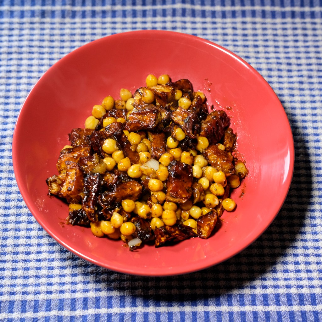 Étape 5: mélange la pulpe d’ail, les dès rôtis et au choix du riz, des lentilles ou des pois chiches et remets au four 5 grosses minutes à 200 degrés.