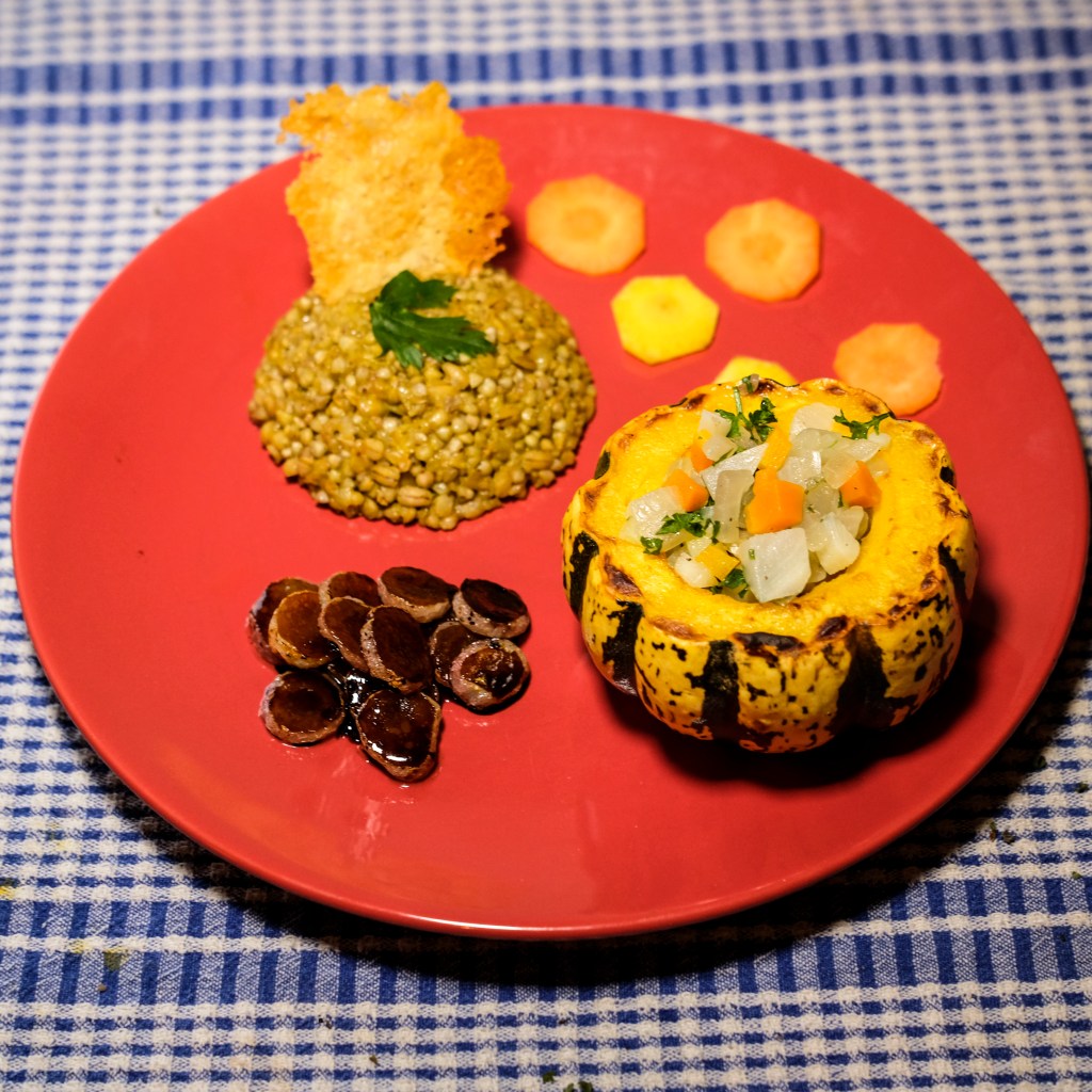 Une réflexion au sujet de « Patidou farci aux légumes racines sarrasin au safran et ocas caramélisés »